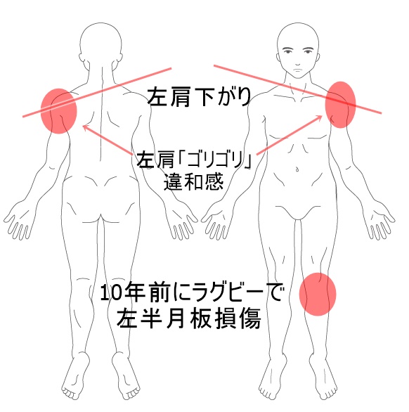左肩は回すと「ゴリゴリ」と違和感がある。立位で左肩が下がっていることも長年気になっている。