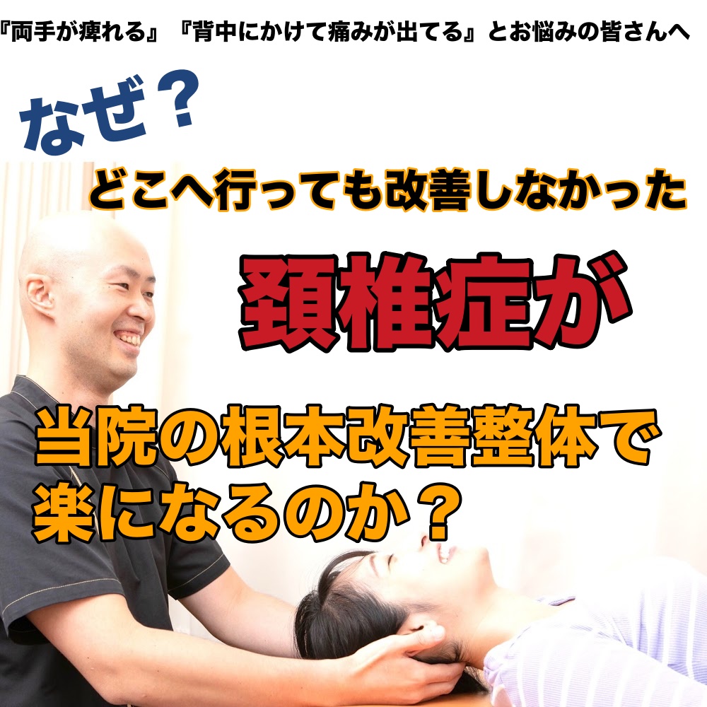 当院は頚椎症を含め首の施術を専門的に行っていて他で良くならなかった方がどんどん良くなっていきます。頚椎症は首以外の原因があり、首の施術を専門的に行っていなければ分からない原因も当院では的確に捉えることが出来ます。